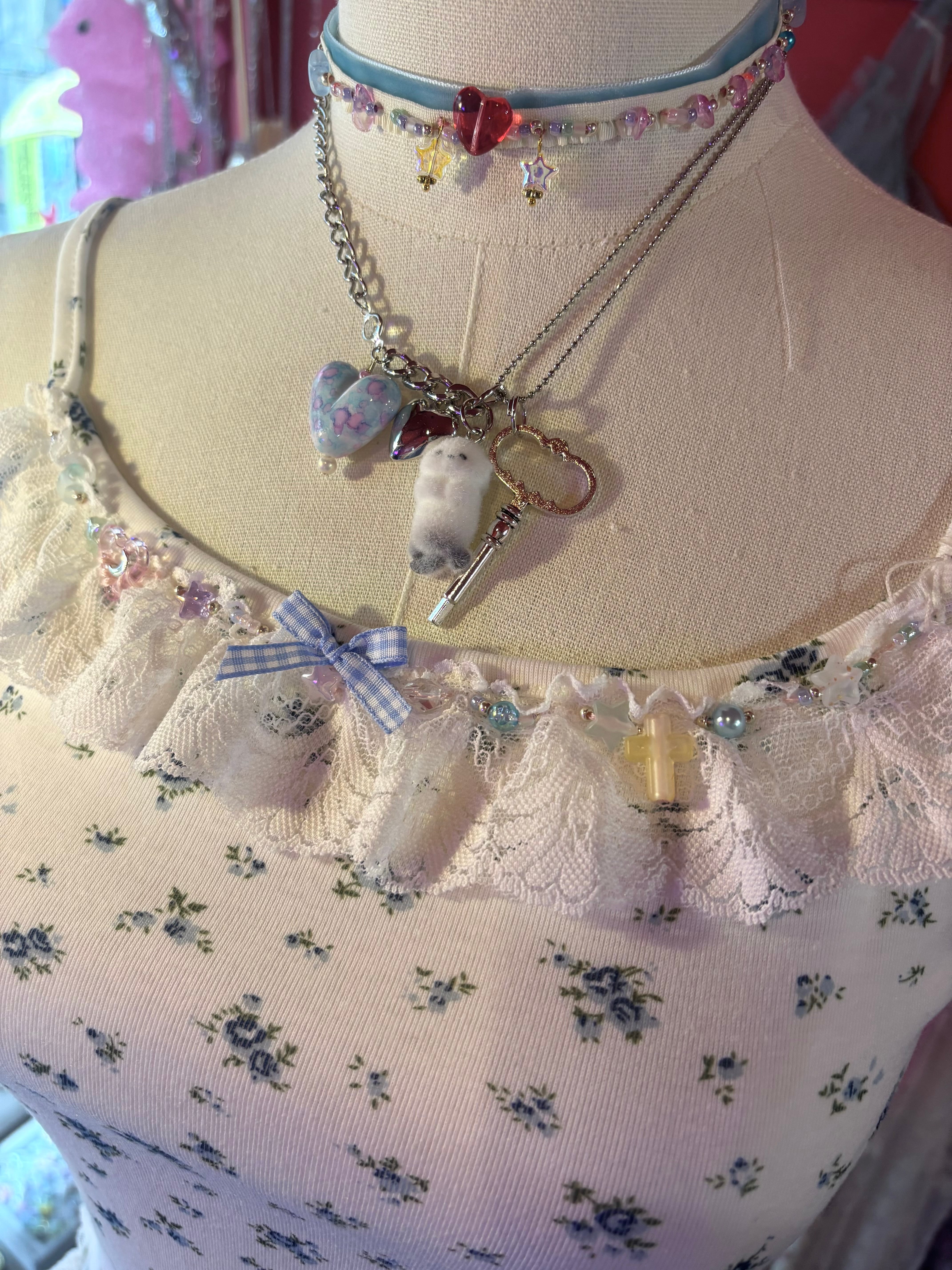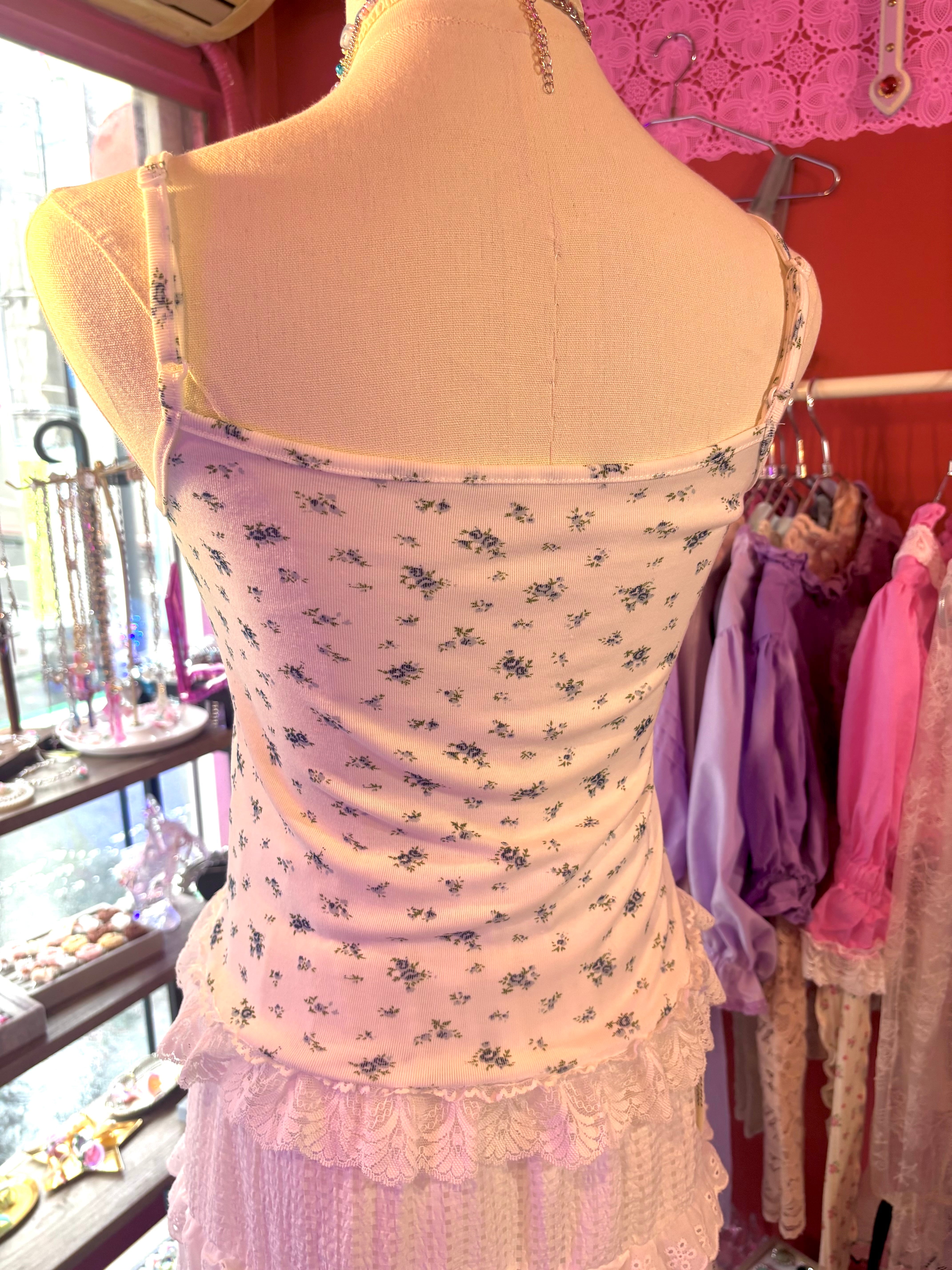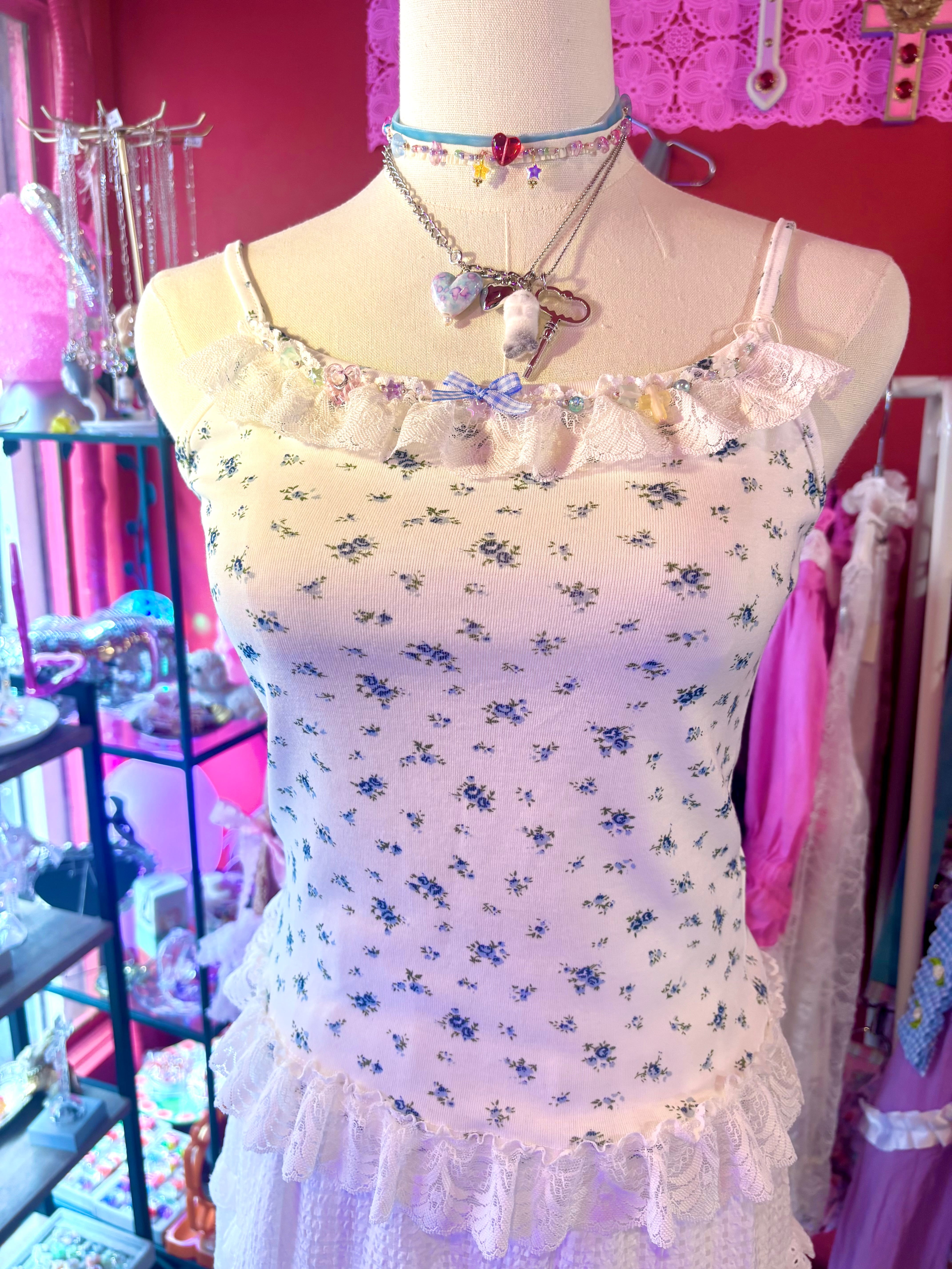 花柄のキャミソールにフリルとビーズでガーリーなリメイクをしたキャミソール。