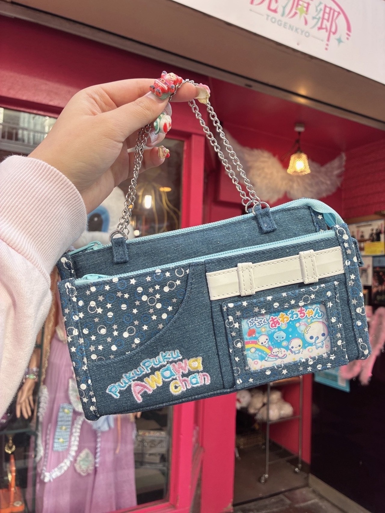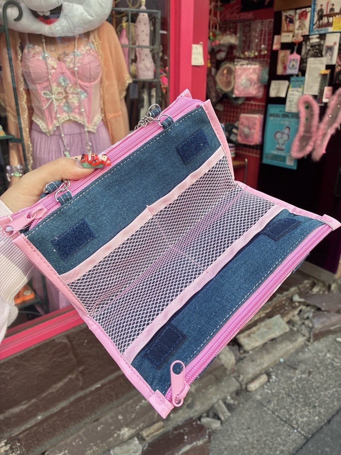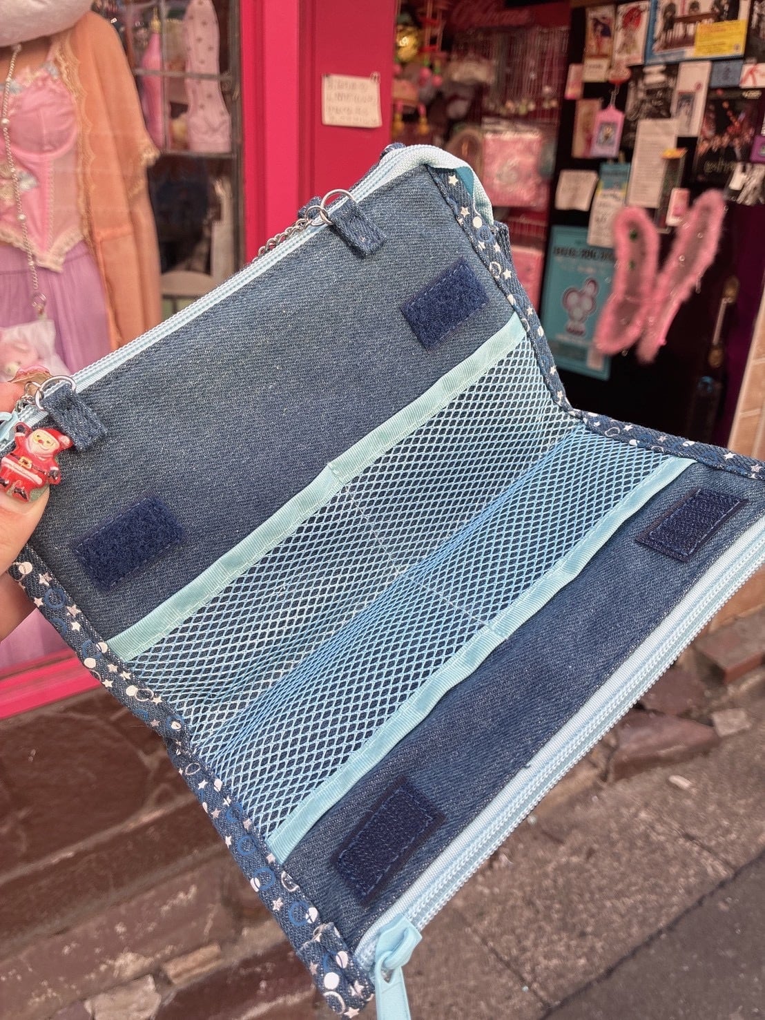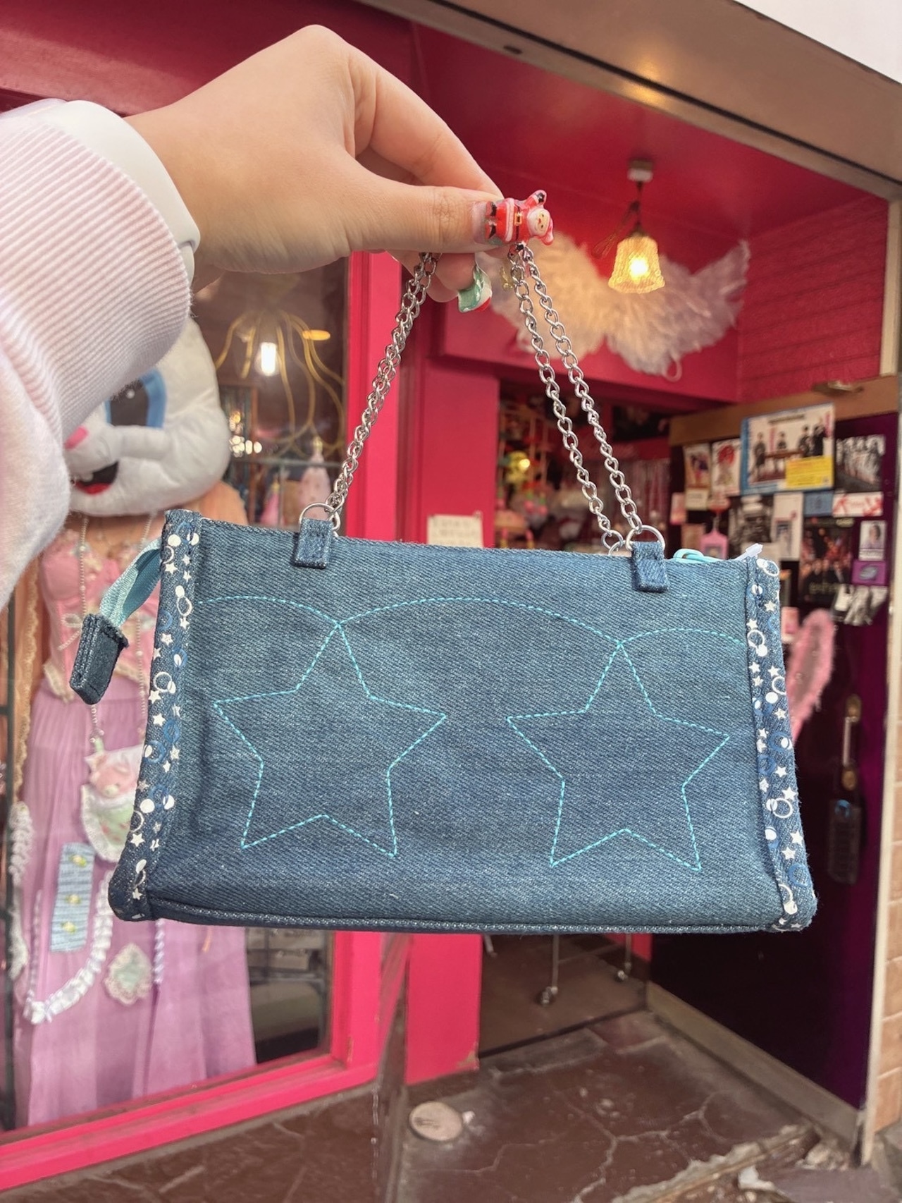 デニム素材に持ち手チェーン付きはもちろん、メッシュポケットなどもちろん多機能!