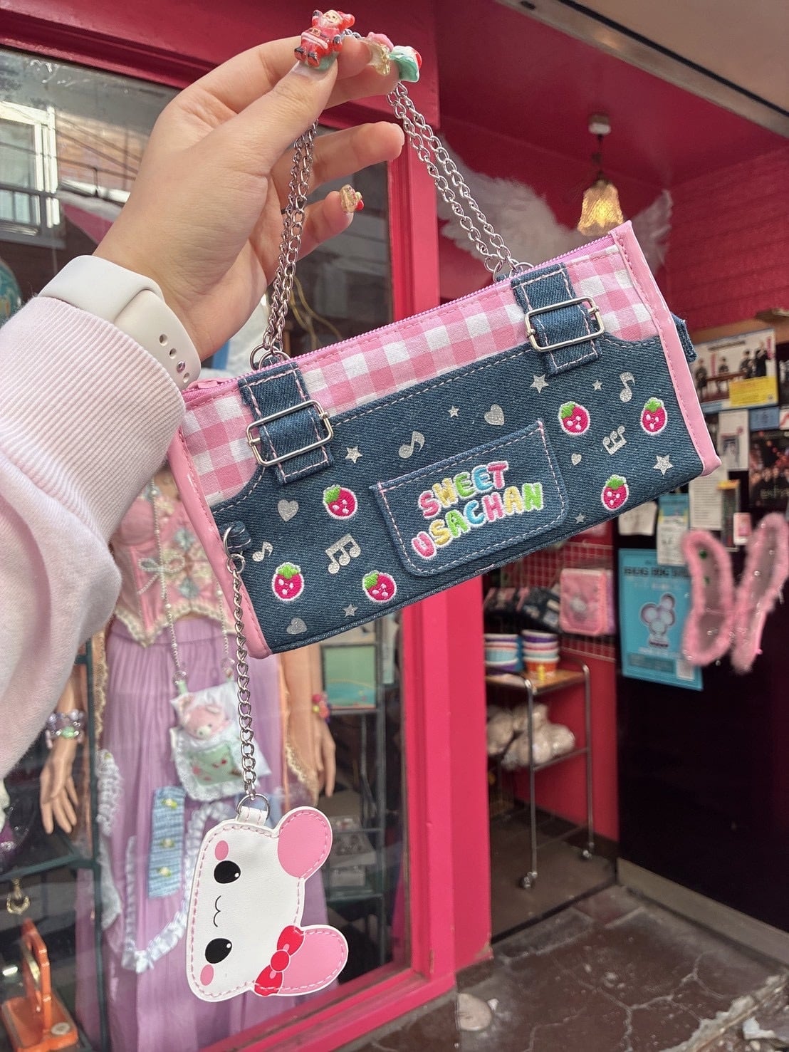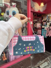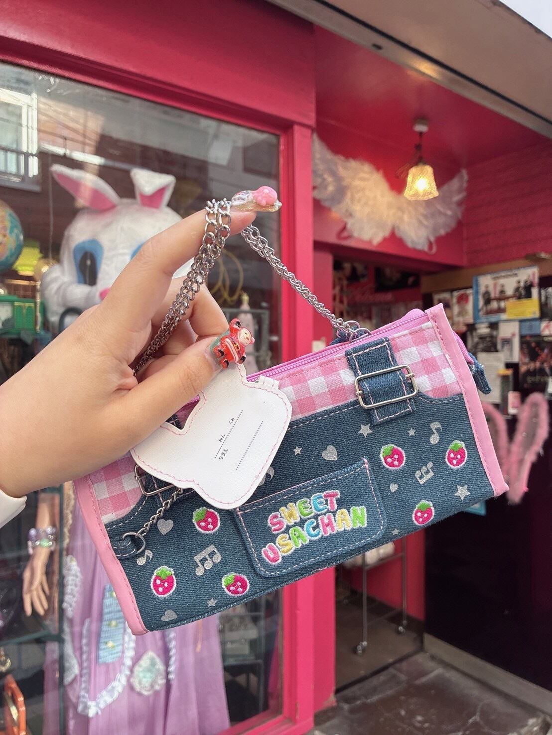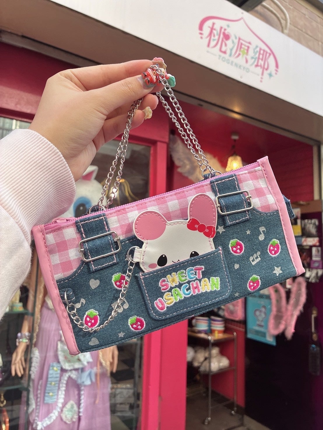 デニム素材に持ち手チェーン付きはもちろん、メッシュポケットなどもちろん多機能!