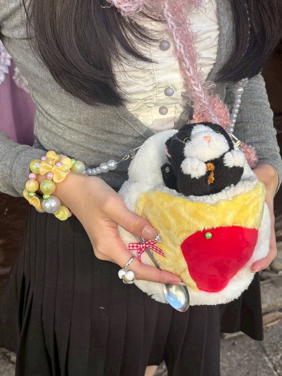 ぬいぐるみをオムライスに包みながら出かけらるショルダー